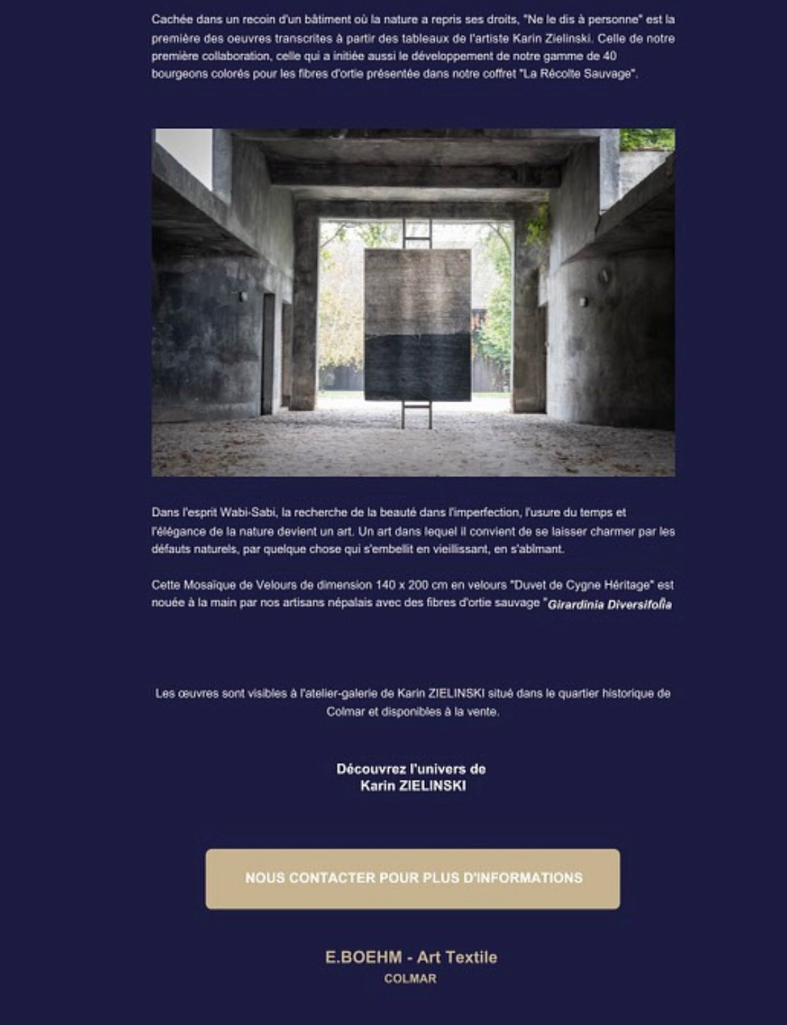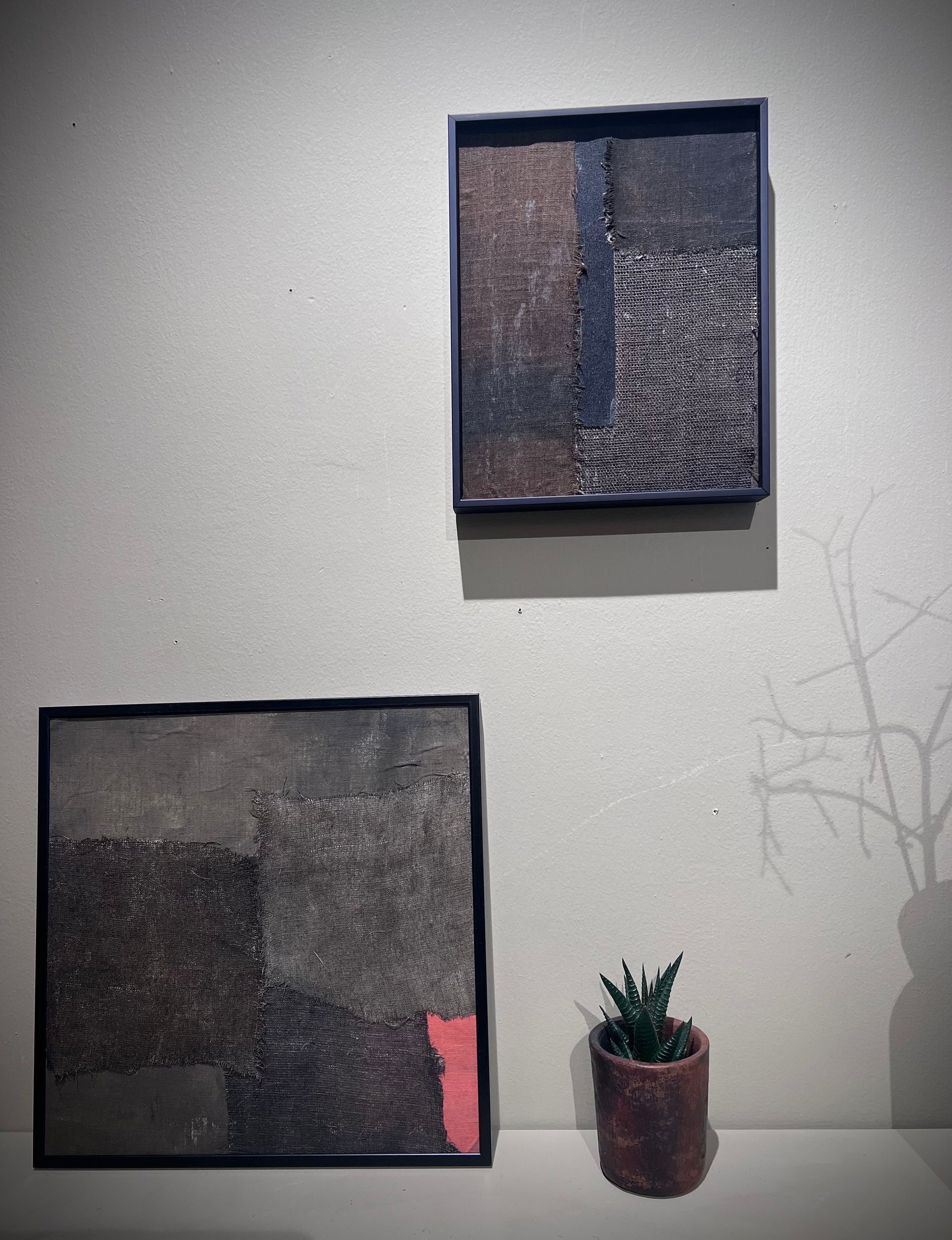 Karin s'inspire d’une philosophie japonaise qui fait référence à un sentiment personnel de sobriété, de paix et d’harmonie, où l’imperfection des objets, l’usure du temps et l’élégance de la nature sont magnifiés. Ce concept esthétique japonais millénaire est le Wabi Sabi*.C‘est également une philosophie de vie. L'artiste l’utilise dans ses collages textiles.